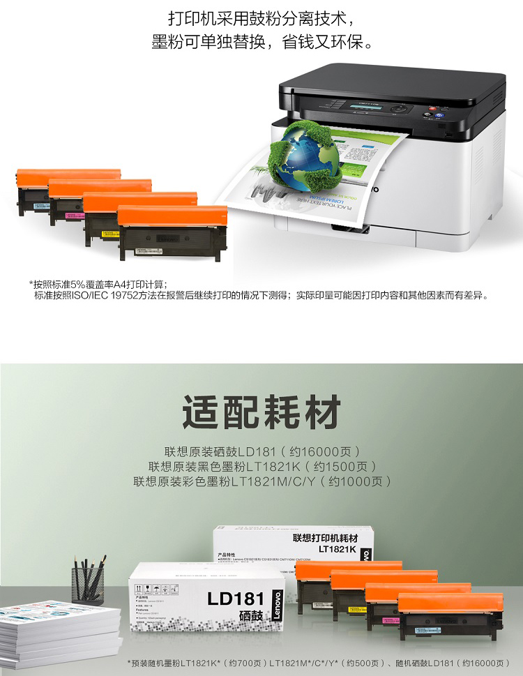 | 零售墨粉型号/容量 | LT1821K:1500页 LT1821M/C/Y:1000页 | 保修和服务信息(售后4008101234) |